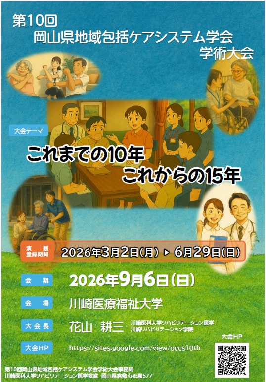 学会・研修会 (他団体)第10回岡山県地域包括ケアシステム学会学術大会 学術大会HP https://sites.google.com/view/occs10th/home?authuser=0 2026年02月10日